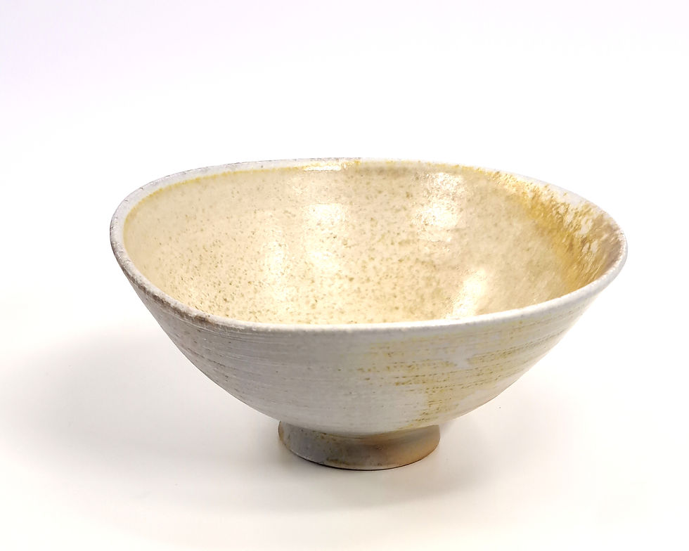 During the multi-day wood firing, melting ash created gentle transitions from sandy beige to warm amber tones, while subtle surface textures emerged naturally from the kiln atmosphere. The interior features a beautifully glazed, speckled finish that adds depth and makes the bowl inviting to use.